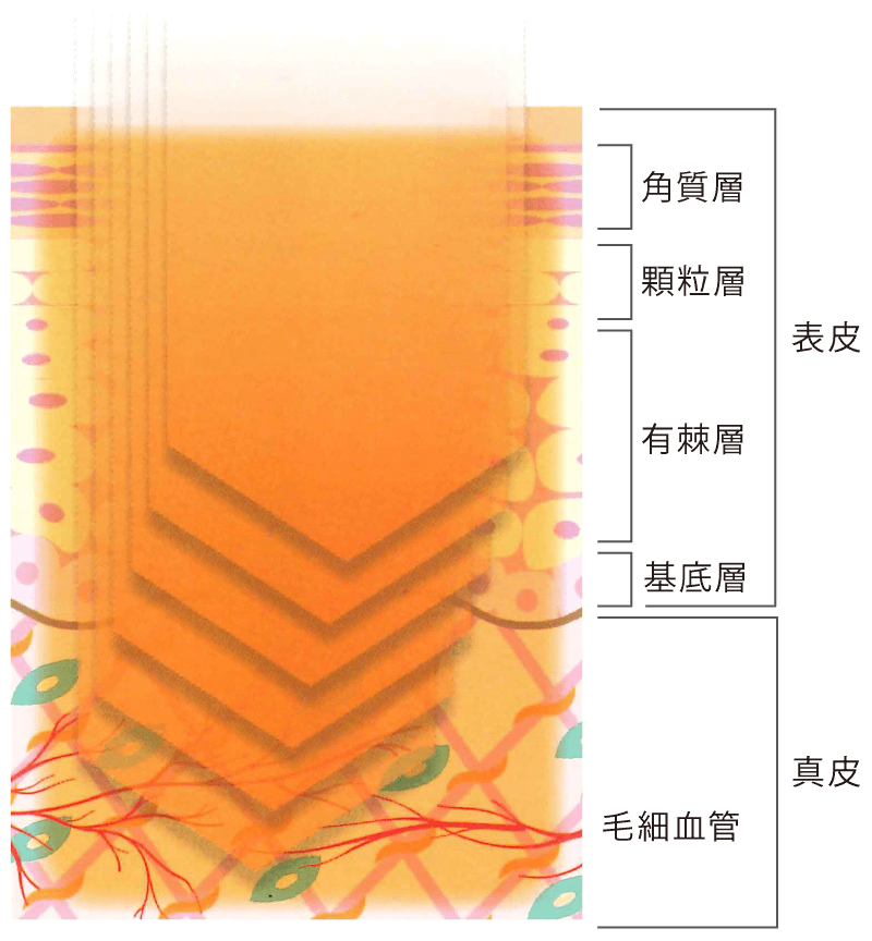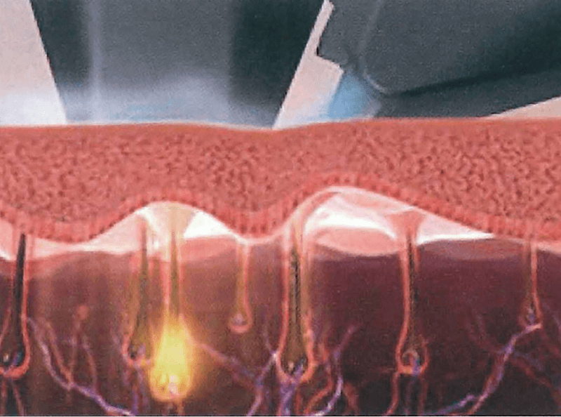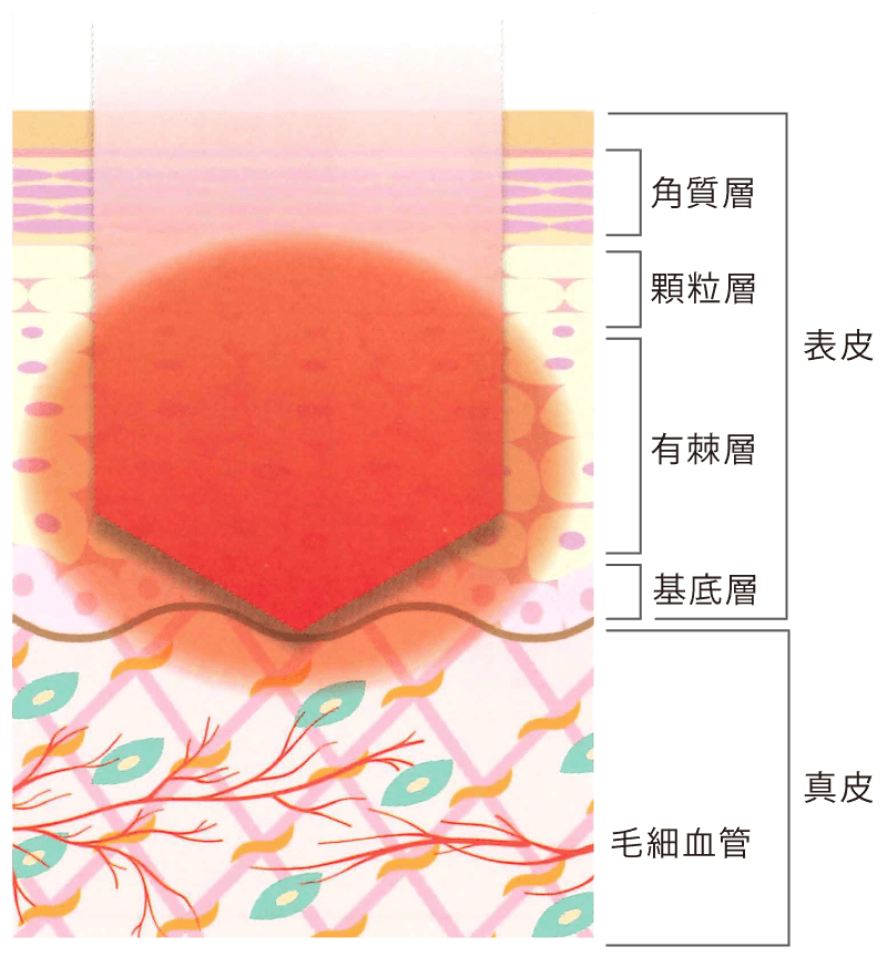- 従来のものより、熱さを感じない光を何度も照射することで、高い熱量を肌の深部に入れることができる。