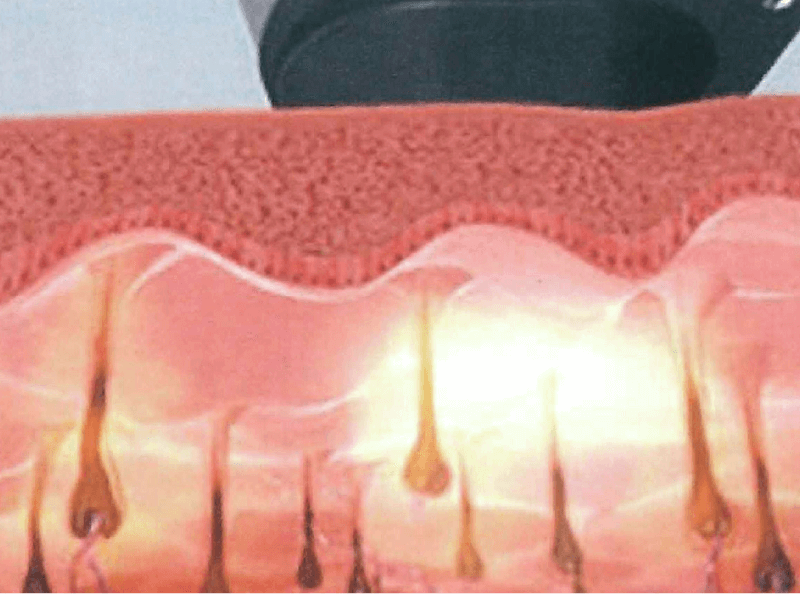 多くの脱毛機が採用している1ショットずつの「スタンピング方式」のような痛みがともなう光を毛根に向かって照射するのではなく、範囲の広い毛包にむけて痛みのともなわない弱めの光を1秒間に2~10回という速さで連続照射し、脱毛します。施術法もこれまでとは違い、やさしく撫でるようにヘッドを滑らせるだけでOK。連続照射で時間短縮が可能になり、お客様にとっても皮膚表面のダメージが少なく、まるで温かいマッサージを受けているような感覚です。