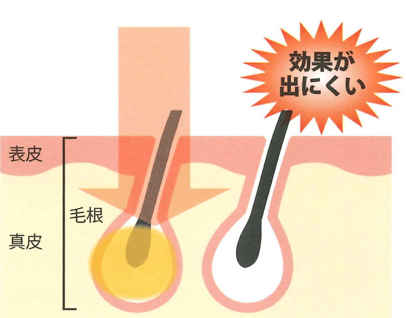 - 色黒の肌、細い産毛や薄い色の毛への対応が難しい毛の黒いメラニン色素をターゲットとするので、毛や肌色の状態によっては施術が行えません。
