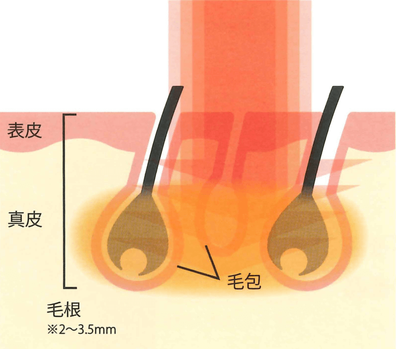 - ターゲットは毛根のメラニン色素現在生えている毛、またはいずれ抜け落ちる毛の毛乳頭部分に対して対処する方法です。