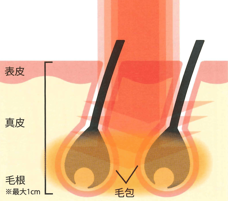 - うぶ毛や金髪、白髪などの毛の太さや色、肌の色に影響されない毛包をターゲットとするので、脱毛部位の毛や肌色がどのような状態でも影響はなく効果が得られます。