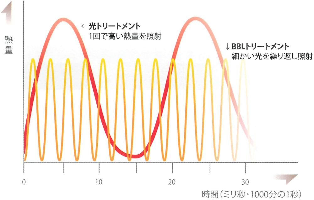 従来の光トリートメントでは熱さや痛みなどのリスクがあリましたが、BBLは専用の波長を、1秒間に10ショット(フェイシャルは6ショット)と短時間により多くの照射して、美肌効果の高い光をたっぷり肌に行き渡らせ、ゆっくりと真皮層を温めていくことで、コラーゲンの修復を高めます。